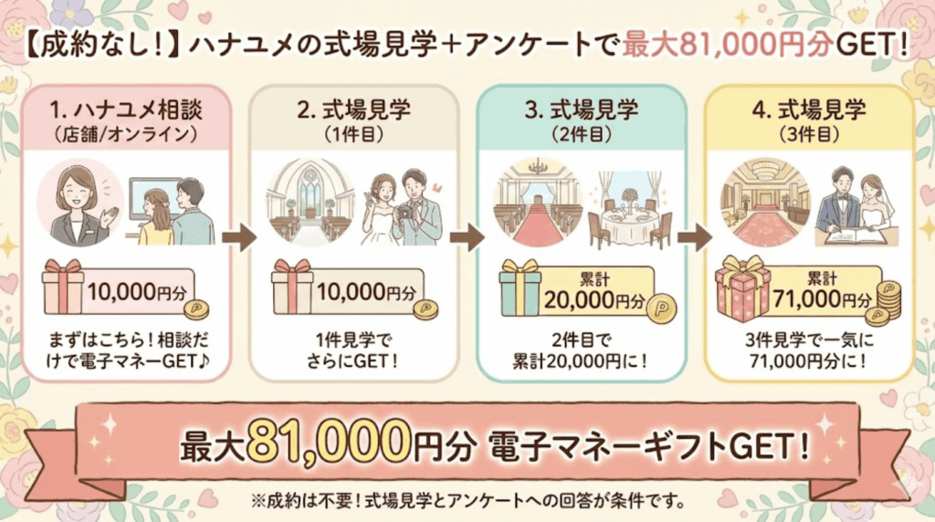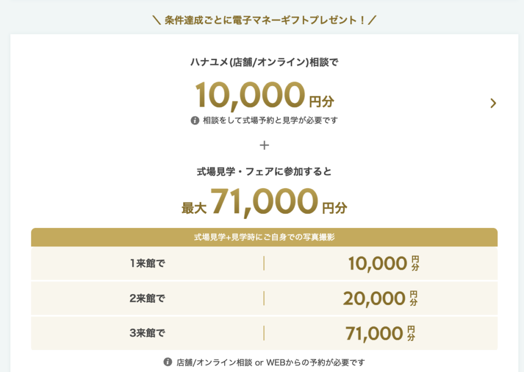 ゼクシィとの決定的な差がここです。ハナユメのキャンペーンは、式場と「成約(契約)」しなくても、見学やフェアに参加するだけで高額な電子マネーギフトがもらえます。
