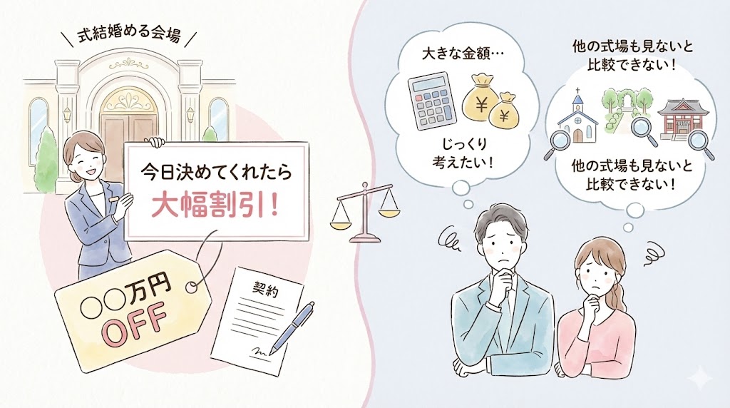例え式場から、「今日決めてくれたら大幅に割り引く」と言われても、大きな金額ゆえにじっくり考える時間も欲しいし、他の式場も見ないことには比較できない、と考えるのが一般的。