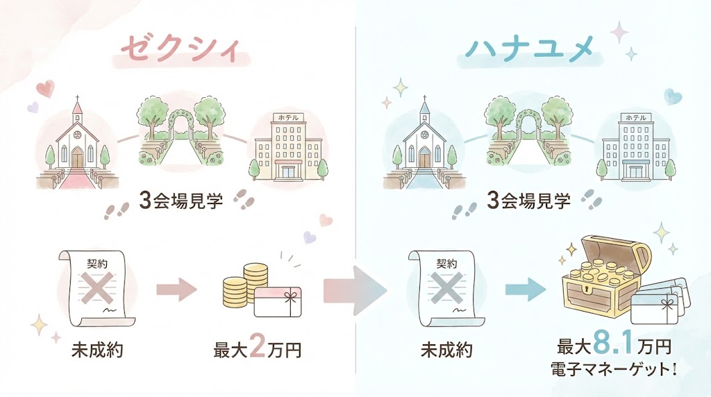 【キャンペーン】成約必須のゼクシィ vs 成約不要・見学だけで高額特典獲得のハナユメ