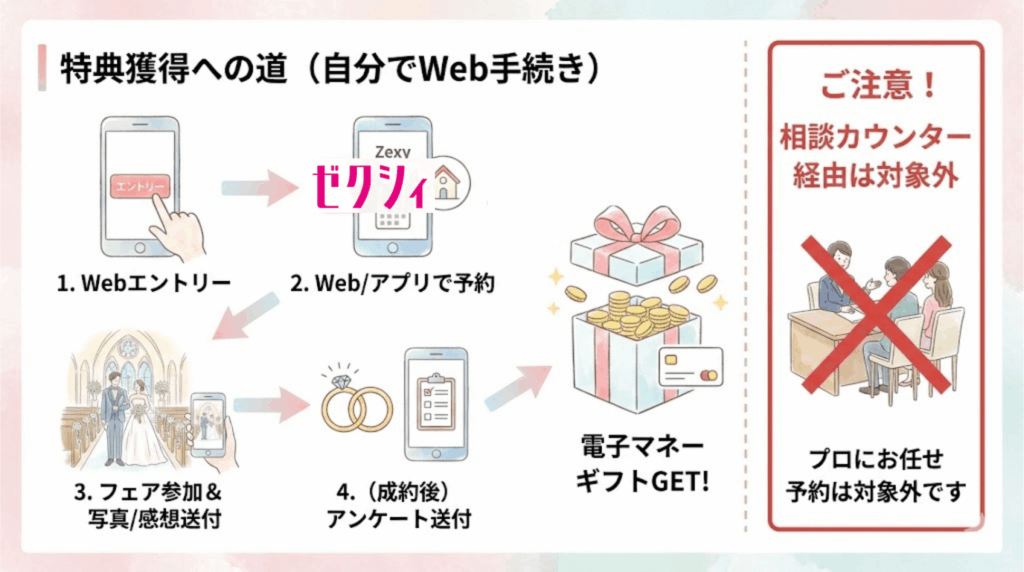 「プロに相談したい」と思って実店舗のゼクシィ相談カウンターへ行くと、Webやアプリ限定の高額キャンペーン(最大数万円分)の対象外になってしまいます。