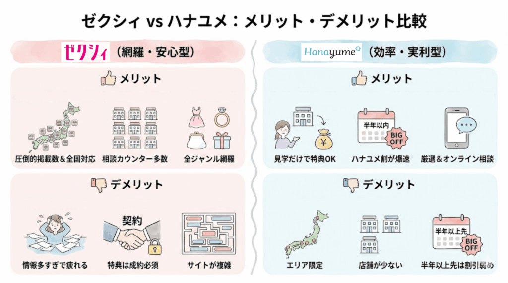 ゼクシィ・ハナユメのメリット・デメリット早見表でおさらい