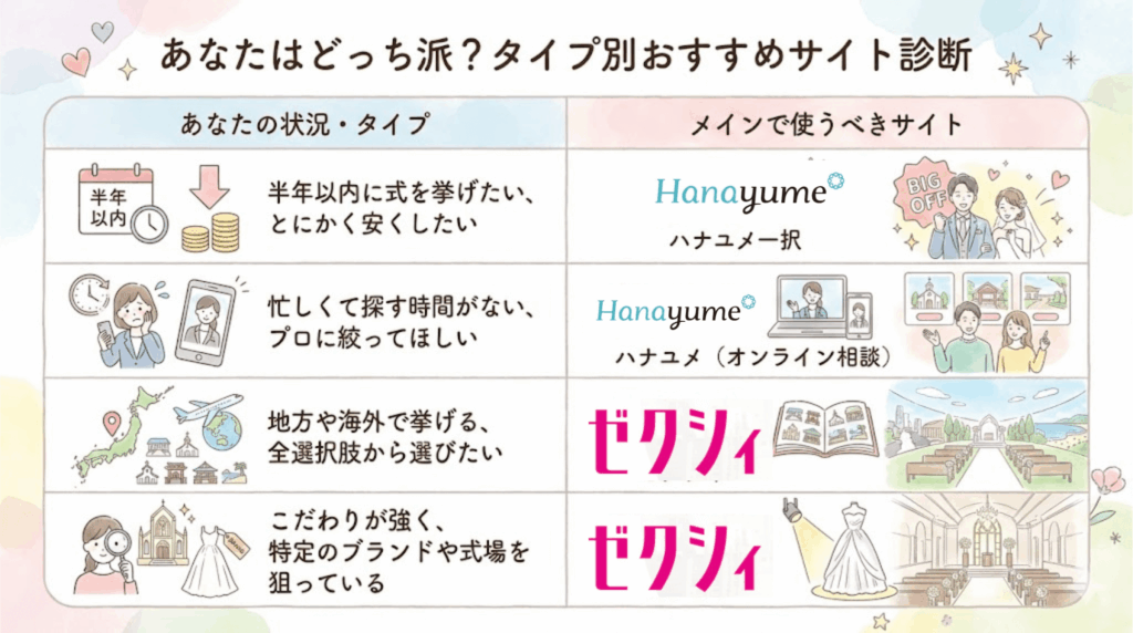 ゼクシィとハナユメは「どちらか片方を選ぶ」のではなく、それぞれの強みを活かして「併用」するのが正解です。